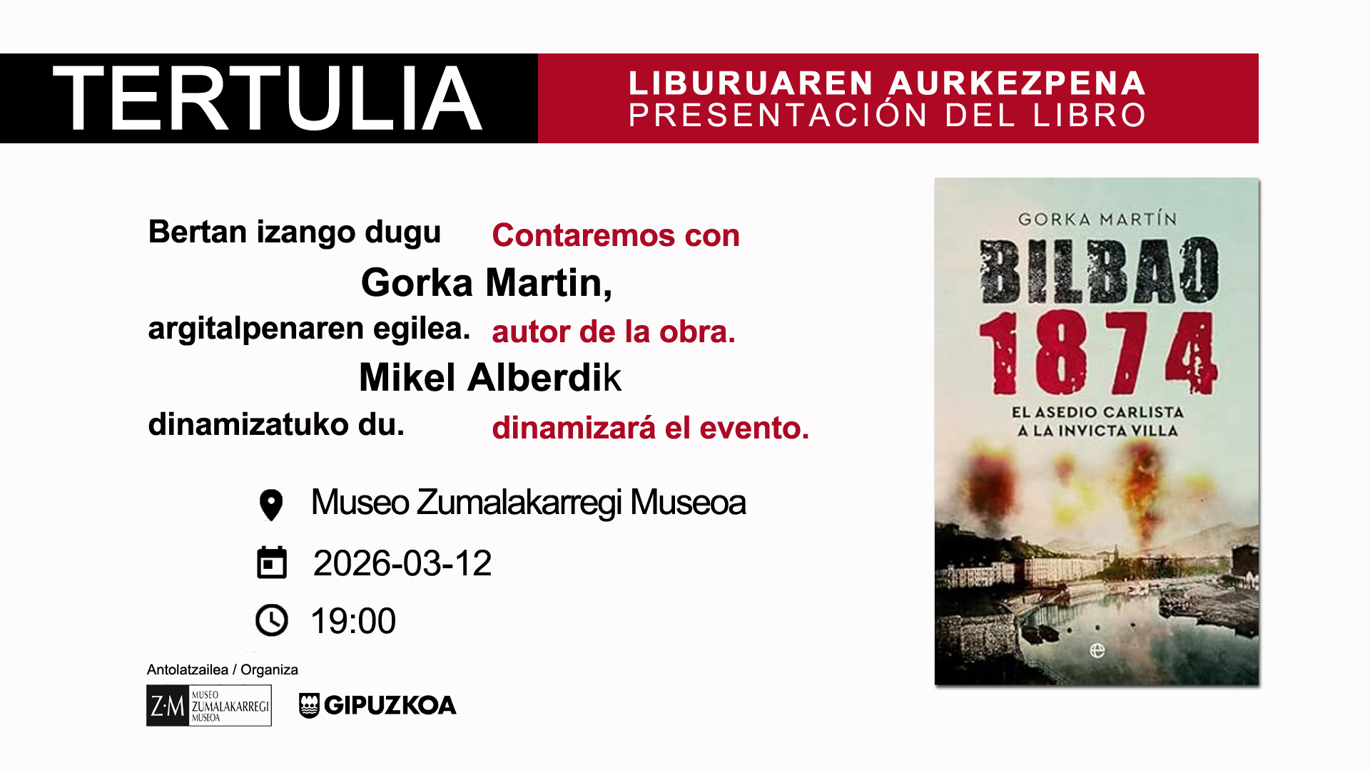Presentación del libreo "Bilbao 1874: el asedio carlista a la invicta villa", acompañados por el autor, Gorka Martin
