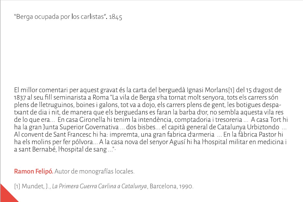 Berga carlina? El millor comentari per aquest gravat és la carta del berguedà Ignasi Morlans[1] del 15 d'agost de 1837 al seu fill seminarista a Roma "La vila de Berga s'ha tornat molt senyora, tots els carrers són plens de lletruguinos, boines i galons, tot va a dojo, els carrers plens de gent, les botigues despatxant de dia i nit, de manera que els berguedans es faran la barba d'or, no sembla aquesta vila res de lo que era... En casa Gironella hi tenim la intendència, comptadoria i tresoreria ... A casa Tort hi ha la gran Junta Superior Governativa ... dos bisbes... el capità general de Catalunya Urbiztondo ... Al convent de Sant Francesc hi ha: impremta, una gran fabrica d’armeria ... En la fàbrica Pastor hi ha els molins per fer pólvora... A la casa nova del senyor Agusí hi ha l'hospital militar en medicina i a sant Bernabé, l'hospital de sang ..."•