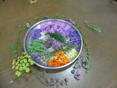 5: Entsalada, letxu, kalabazin, azenario eta hainbat lora eta belar basatiekin. Mihilu ozpinez goxatua.