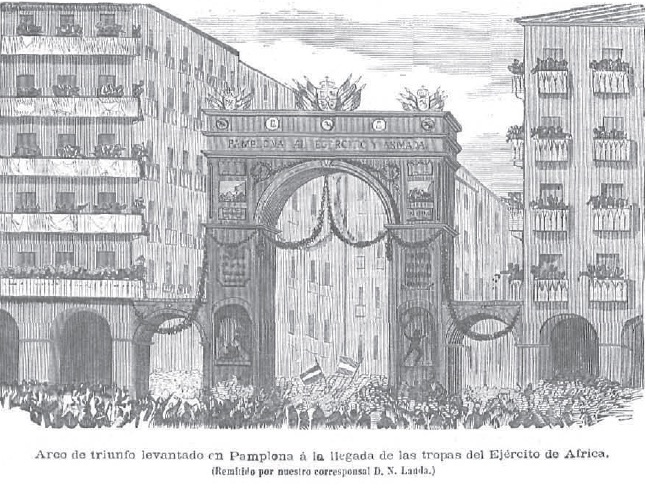 Afrikako gerra. Euskal Herrian ere ospatu zen garaipena. Hemen Iruñan antolatutako harrera Nicasio Landaren marrazkian.